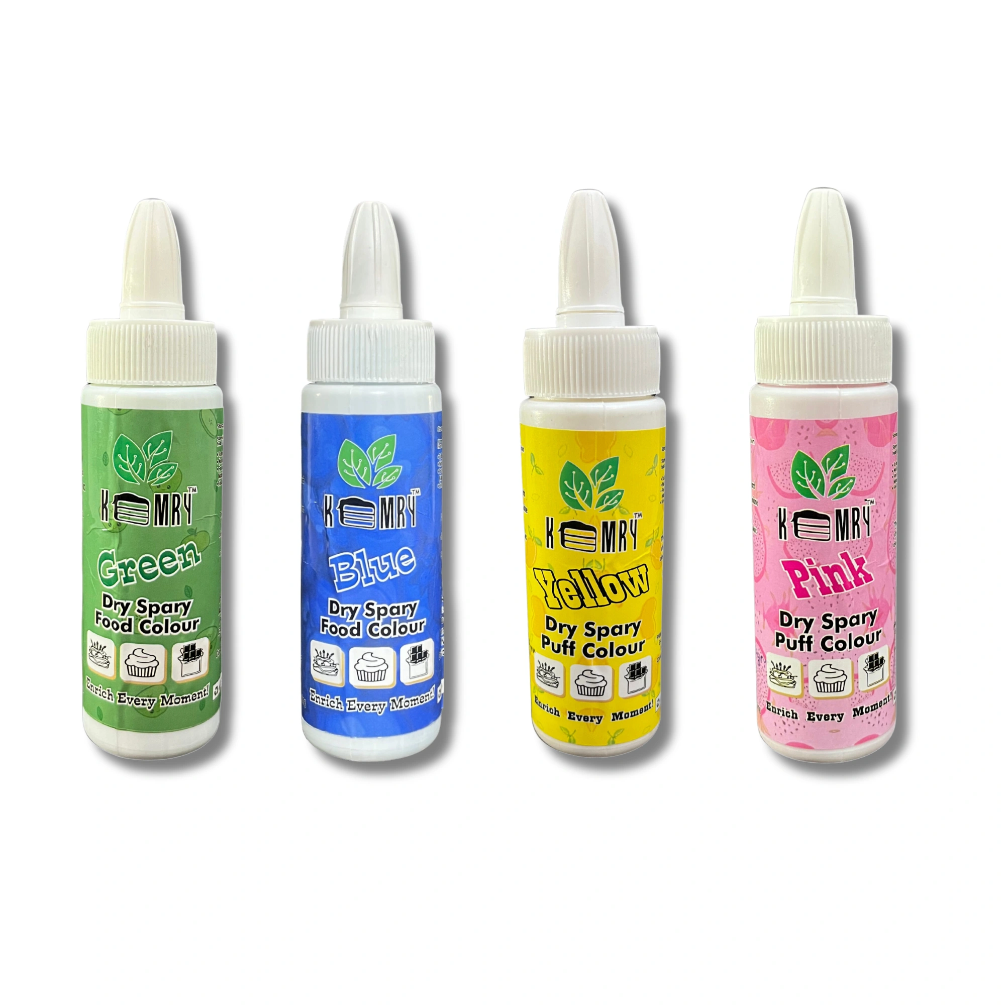 Kemry Edible Dry Puff Food Colour (Green, Blue, Yellow, Pink) offers versatile application across cakes, cupcakes, cookies, doughnuts, ice cream, candies, and sweet decorations. With vibrant and long-lasting colors, it ensures visually appealing treats. Its professional-grade formulation guarantees consistent performance and easy integration into recipes, allowing for precise application and intricate designs. ( Per Bottle Weight is 60gm ).